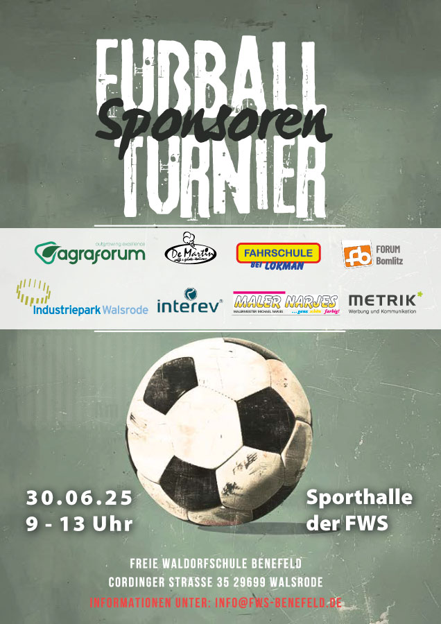 Am 30. Juni verwandelt sich die Sporthalle der Freien Waldorfschule Benefeld in ein wahres Fußballstadion: Die Schülervertretung der Schule veranstaltet ein Sponsoren-Fußballturnier zugunsten von Waldorfschulen in Not, die über den Bund der freien Waldorfschulen i…