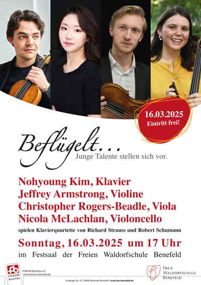 Der Winter scheint sich langsam zu verabschieden und auch wir verabschieden uns mit einem letzten Konzert der Saison der Konzertreihe Beflügelt. Sie dürfen sich auf ein exzellentes Kammermusikkonzert am Sonntag, 16. März 2025, 17.00 Uhr im Festsaal der Waldorfschule Benefeld freuen.